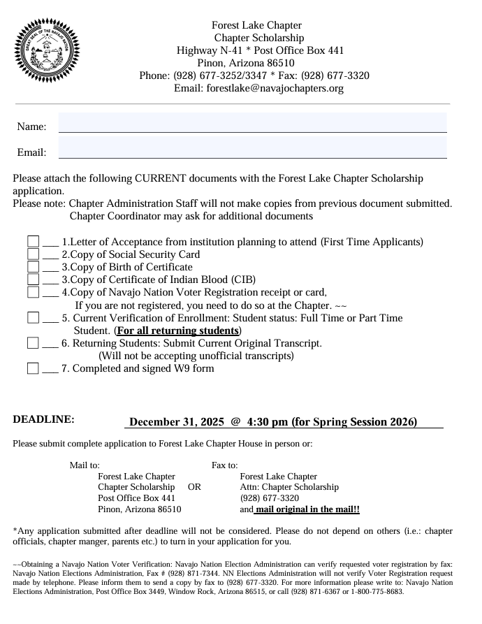 Submit application: in-person, by mailing original documents, fax to 928-677-3320 or email at forestlake@navajochapters.org. Please do not depend on others to turn in your application for you. Thank you.