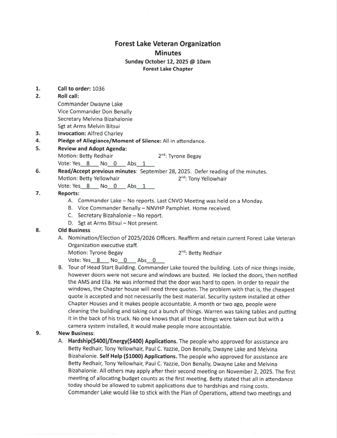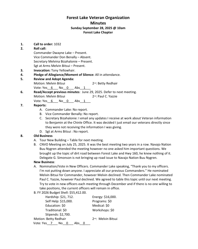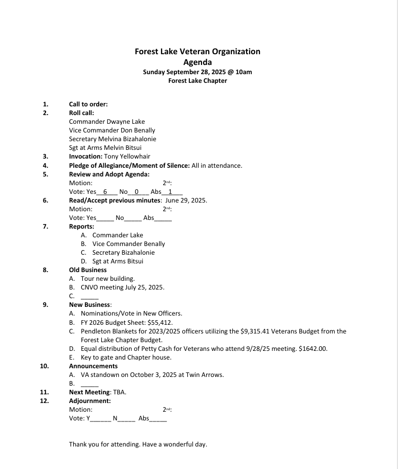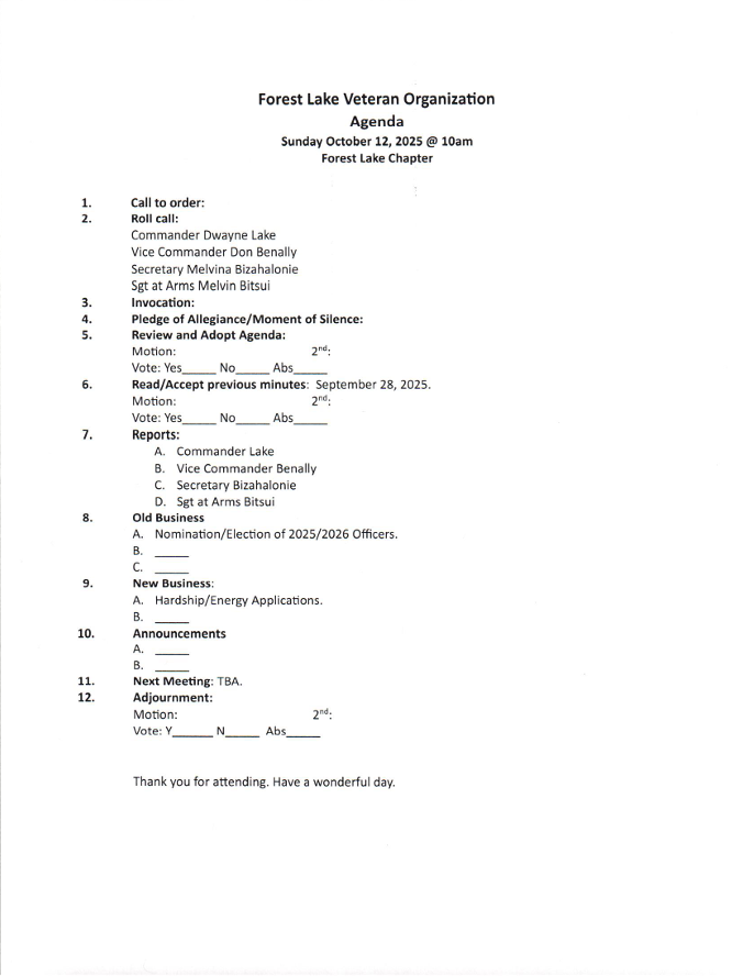 Veteran Committee Forest Lake Chapter Veterans Committee Dewayne Lake | CommanderKee Yonnie | Vice CommanderMelvina James | Secretary October 2025 Meeting Agenda October 2025 Meeting Minutes September 2025 Meeting Agenda September 2025 Meeting Minutes